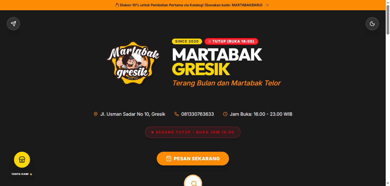 Pemilik toko dapat mengubah jam operasional, kode promo, hingga daftar menu melalui satu file konfigurasi (src/data/config.ts).