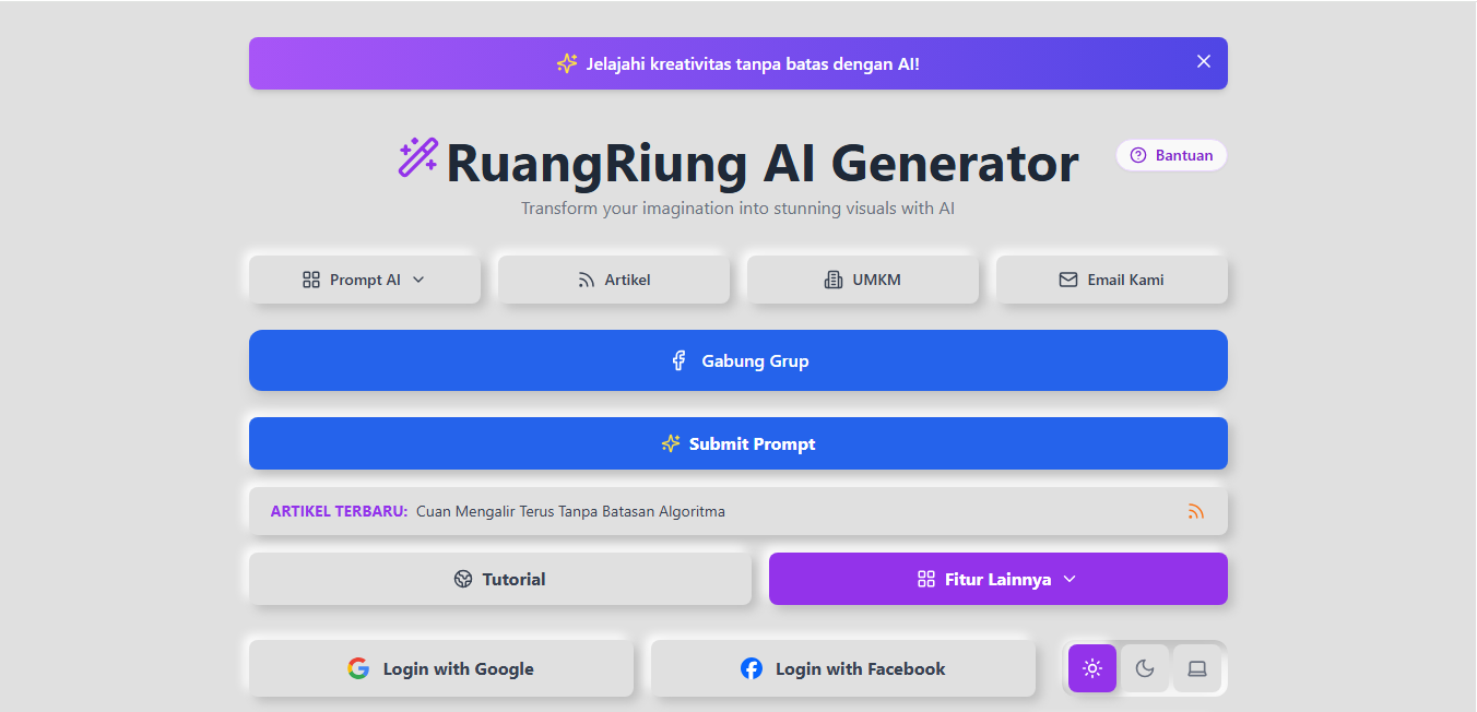 Web application komprehensif yang dirancang untuk memfasilitasi kreator konten dalam memproduksi aset digital berbasis AI (teks, gambar, audio, hingga video) dalam satu antarmuka yang intuitif dan responsif.